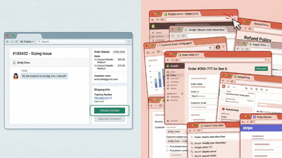 Zendesk has a Shopify integration. It surfaces order information. But it's read-only. Agents still switch to Shopify tabs for refunds, modifications, or any actual action. The context-switching adds up across hundreds of daily tickets into roughly 1-2 hours of lost productivity per agent per day.